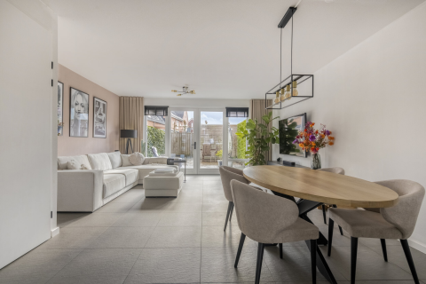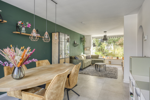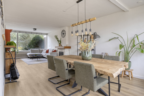 De doorzonwoonkamer van 7,28 meter lang en 3,56 meter breed heeft grote raampartijen aan beide zijden, wat zorgt voor een prettige lichtinval. De ruimte is afgewerkt met een laminaatvloer, strak plafond en behangen wanden. De huidige bewoners hebben gekozen voor een zithoek aan de voorzijde en een eethoek aan de achterzijde, maar je kunt hier eenvoudig je eigen indeling maken.